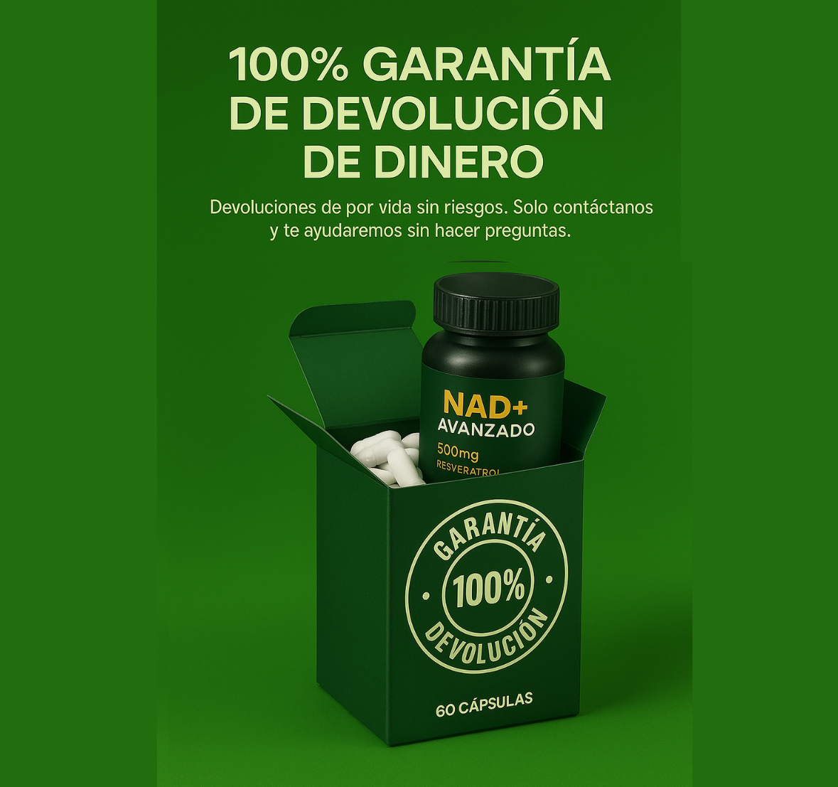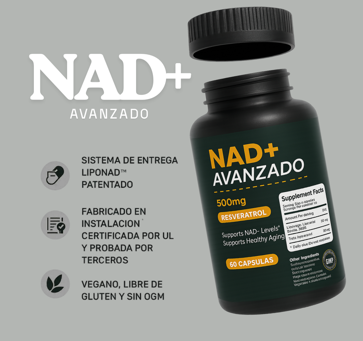 500 mg de NAD+ liposomal para energía, foco y piel más firme en cada cápsula.